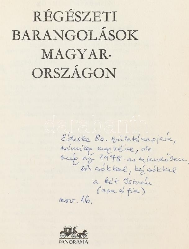 Régészeti barangolások Magyarországon. Szerk.: Szombathy Viktor. Írták: Bakay Kornél, Dienes István és mások. Bp., 1978, Panoráma. Kiadói egészvászon-kötés, kissé sérült papír védőborítóban. Dienes István (1929-1995) régész, muzeológus, a könyv egyik írójának és fiának ajándékozási soraival édesanyja számára.