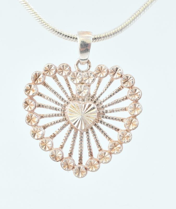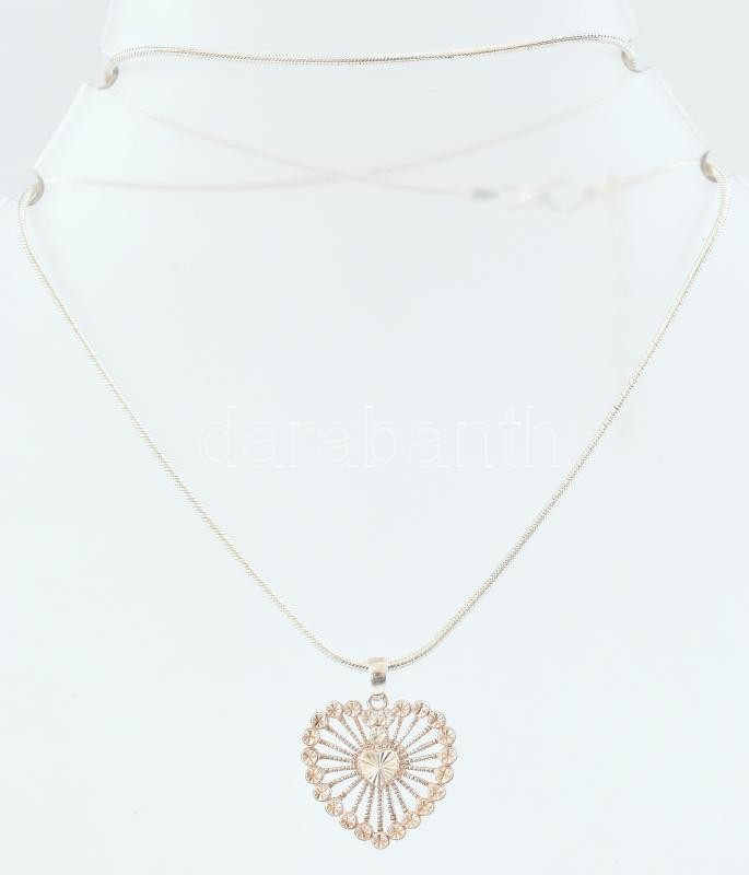 Beschreibung: Ezüst(Ag) kígyó nyaklánc, áttört szív medállal, jelzett, állítható h: 45-50 cm, 2,5×2,2 cm, nettó: 8,3 g