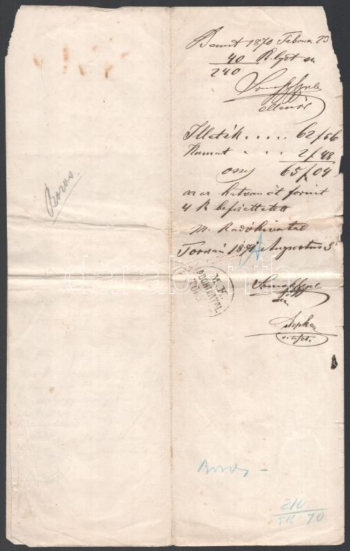 Beschreibung: 1870 Hidvégardó, adásvételi szerződés, 50 Kr okmánybélyeggel, hátoldalán illeték befizetését igazoló későbbi feljegyzéssel