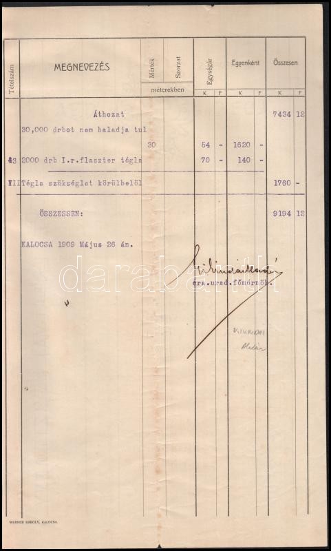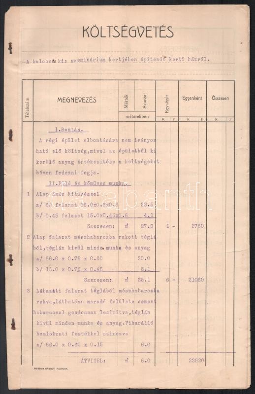 1909 Kalocsai papi szeminárium kerti házának költségjegyzéke, 11p https://www.darabanth.com/de/402-Fernauktion/402.0/Kunst-Dokumente-andere-Sammelgebiete/Dokument~500018/1909-Kalocsai-papi-szeminarium-kerti-hazanak-koltsegjegyzeke-11p~II2469330