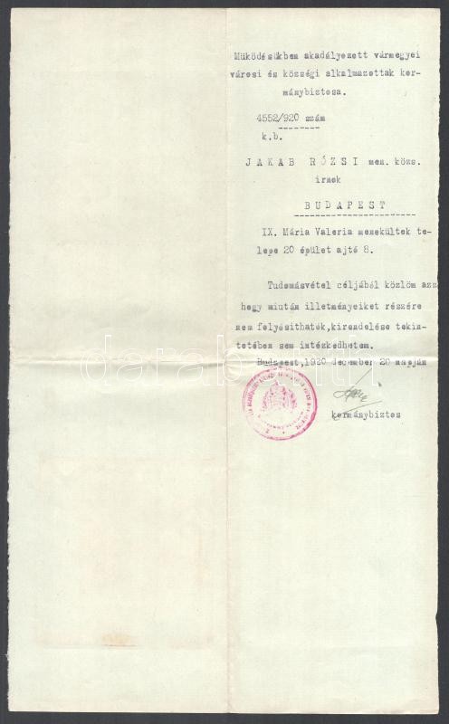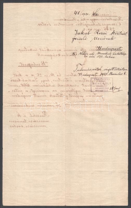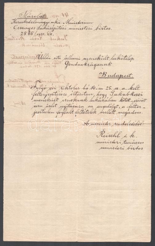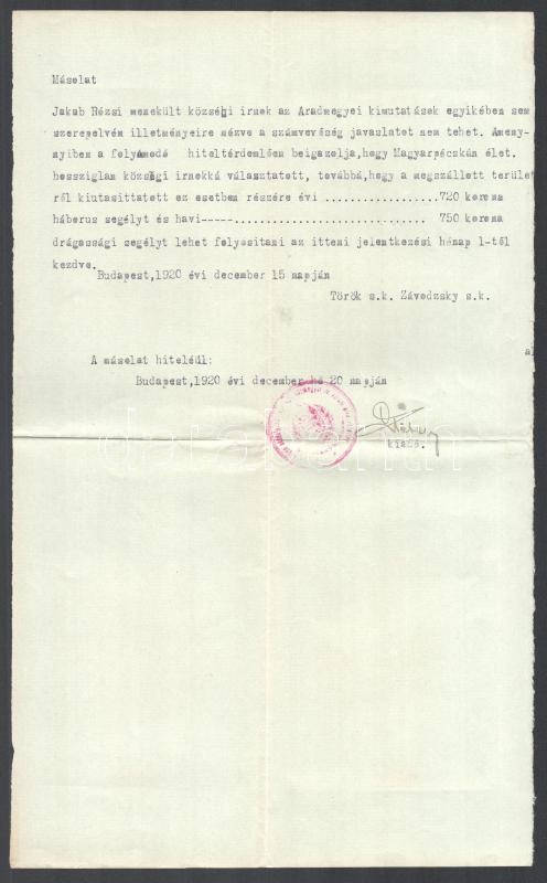 Beschreibung: 1920-1921 A trianoni döntés nyomán Aradról kiutasított személy papírjai a Mária Valéria menekültek telepére címezve