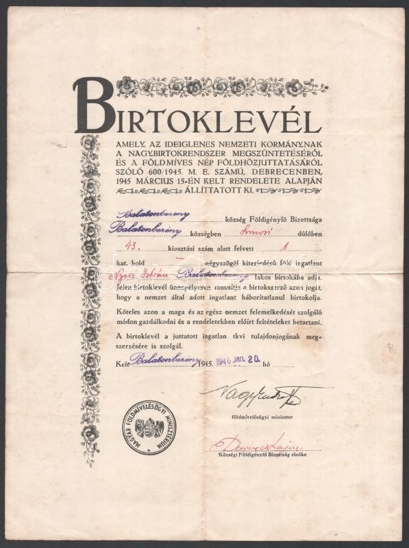 1946 Balatonberény, az Ideiglenes Nemzeti Kormány nagybirtokrendszer megszüntetéséről szóló rendelete alapján kiadott birtoklevél, pecséttel, aláírással, kissé foltos, hajtott