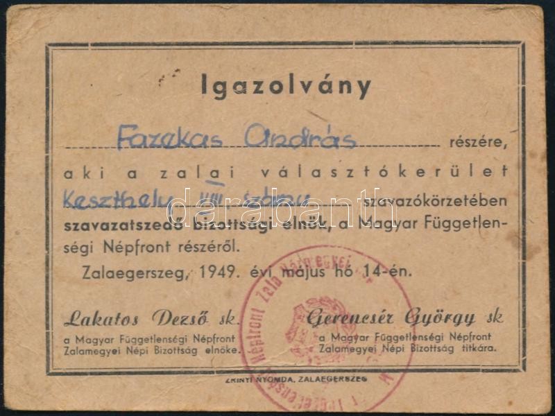 1949 Magyar Függetlenségi Népfront által kiállított igazolvány a Keszthely VIII. számú szavazókörzet szavazatszedő bizottsági elnöke részére (Zala vármegye), pecséttel