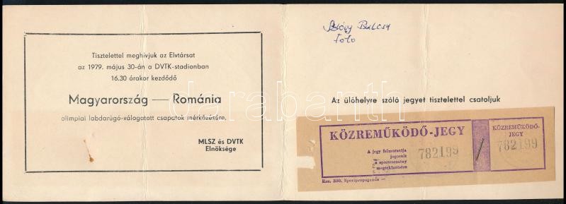 Beschreibung: 1979 Magyarország-Románia olimpiai labdarúgó-válogatott csapatok mérkőzése meghívó és közreműködő jegy, hajtott