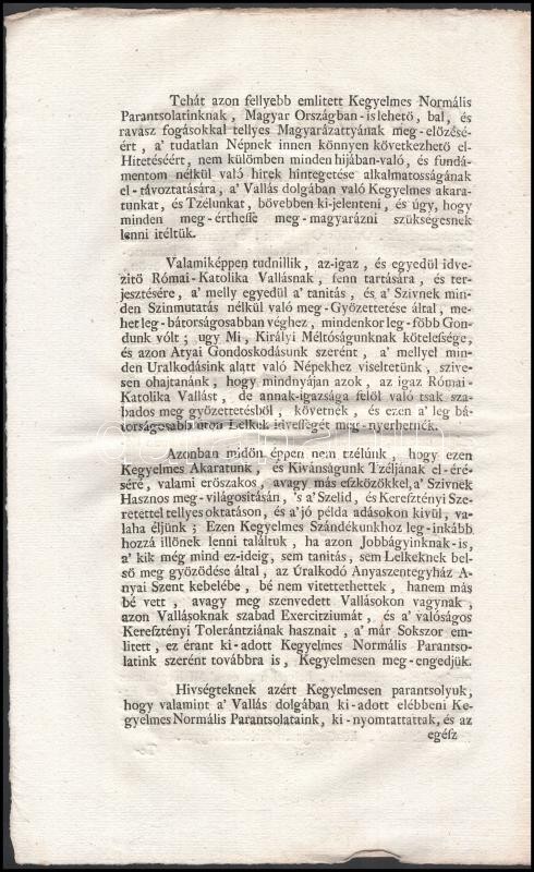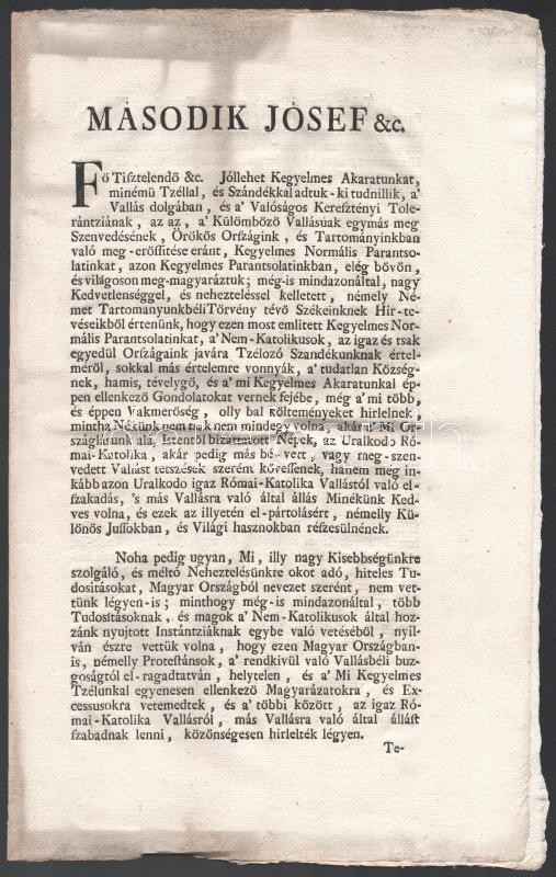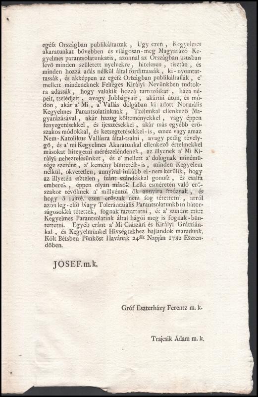1782 II. József császár leirata a vármegyékhez a korábban kiadott, szabad vallásgyakorlást lehetővé tevő Türelmi rendelet magyarázatáról. A leirat szeint sokan félremagyarázzák a rendeletet és megerősíti, hogy a katolikus vallást tartja üdvözítőnek, azonban arra senkit erőszakkal nem téríthetnek át, csak szabad meggyőződésből térhetnek át, aki ezt megszegi, súlyos büntetést kap. 3 beírt oldal gr. Esterházy Ferenc nyomtatott ellenjegyzésével