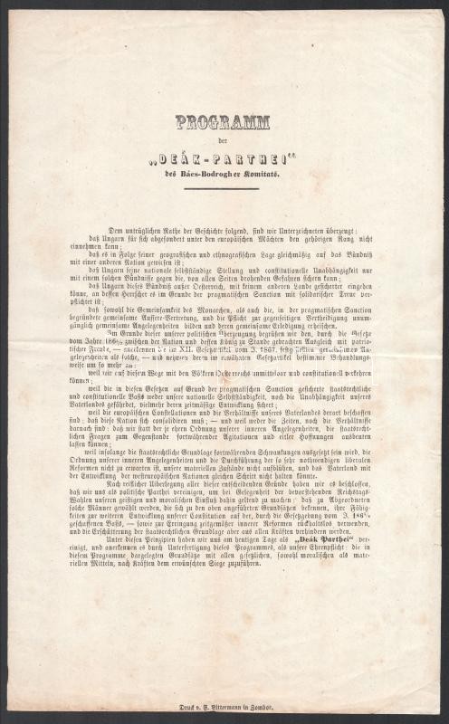 1869 Deák-párt Bács-Bodrog megyei programja német nyelven https://www.darabanth.com/de/402-Fernauktion/402.0/Kunst-Dokumente-andere-Sammelgebiete/Drucksachen~500031/1869-Deak-part-Bacs-Bodrog-megyei-programja-nemet-nyelven~II2469318