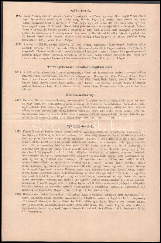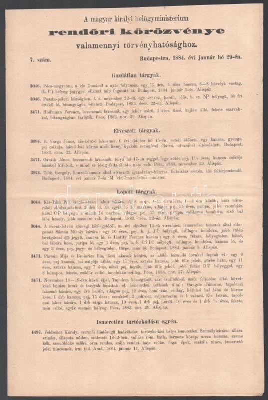 Beschreibung: 1883 M. kir belügyminisztérium körözvényei. elveszett, ellopott tárgyak, talált gyermek, stb 4 p.