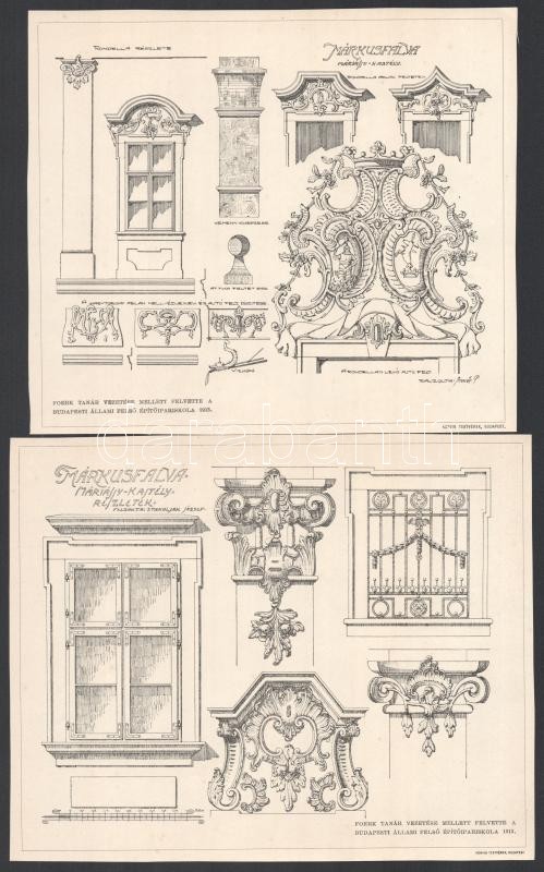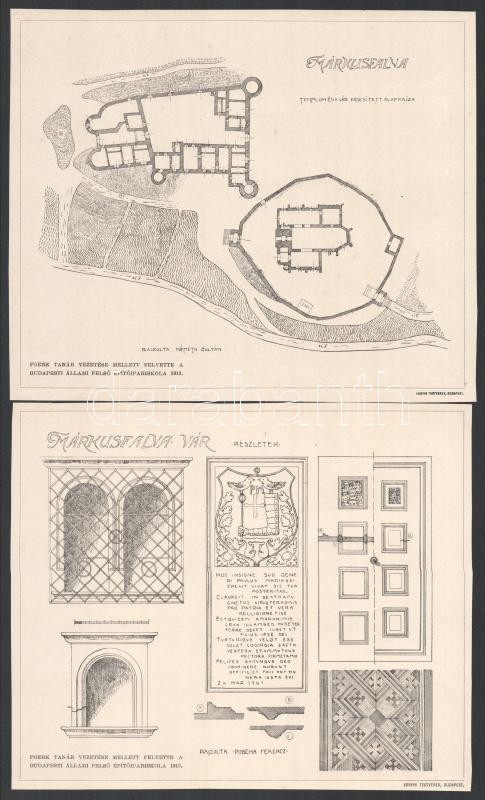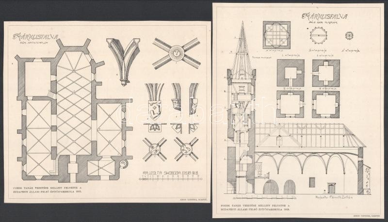 1913 Márkusfalva, Máriássy-kastély, róm. kat. templom, vár, részletek és alaprajzok, 10 db nyomat, Korvin Testvérek Bp., 21,5x17,5 cm és 22,5x18,5 cm közötti méretben