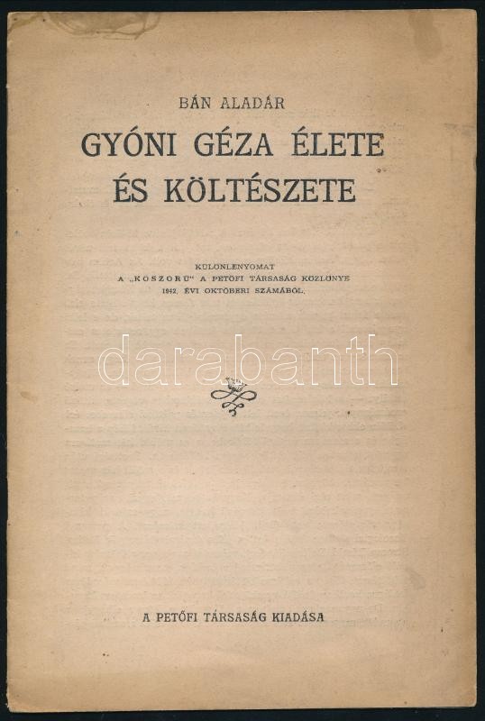 Bán Aladár: Gyóni Géza költészete és művészete. Bp., 1942. Petőfi társ... https://www.darabanth.com/de/402-Fernauktion/402.0/Kunst-Dokumente-andere-Sammelgebiete/Drucksachen~500031/Ban-Aladar-Gyoni-Geza-kolteszete-es-muveszete-Bp-1942-Petofi-tarsasag-16p~II2468617