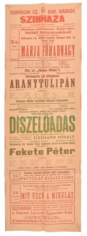 1943 Sopron sz. kir. város város színházának novemberi-decemberi előadásai, plakát, papír, hajtásnyomokkal, kisebb szakadásokkal, lap szélén ragasztás nyomaival, 94,5x31,5 cm