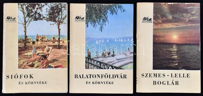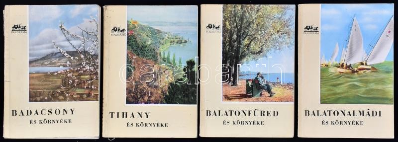 Panoráma Útikönyvek Balatoni sorozata I-X. kötet, teljes. (A teljes sorozat egyben ritka!) I. köt.: Siófok és környéke. Balatonaliga, Balatonvilágos, Balatonszabadi., II. köt.: Balatonföldvár. Zamárdi. Szántód, Balatonszárszó., III. köt.: Szemes, Lelle, Boglár. IV. köt.: Fonyód és környéke. Balatonmáriafürdő, Balatonkeresztúr, Balatonberény, Balatonszentgyörgy. V. köt.: Keszthely és környéke. Gyenesdiás, Vonyarcvashegy, Balatonederics, Balatongyörök. VI. köt.: Hévíz és környéke. VII. köt.: Badacsony és környéke. Balatonszepezd, Révfülöp, Balatonrendes, Szigliget, Tapolca. VIII. köt.: Tihany és környéke. Aszófő, Örvényes, Balatonudvari, Balatonakali, Zánka. IX. köt.: Balatonfüred és környéke. Alsóörs, Csopak. X. köt.: Balatonalmádi és környéke. Balatonakarattya, Balatonkenese, Balatonfűzfő, Vörösberény. Bp., 1958., Panoráma. Gazdag fekete-fehér képanyaggal, térképekkel illusztrált. Kiadói papírkötésekben, VII. kötet gerince sérült.