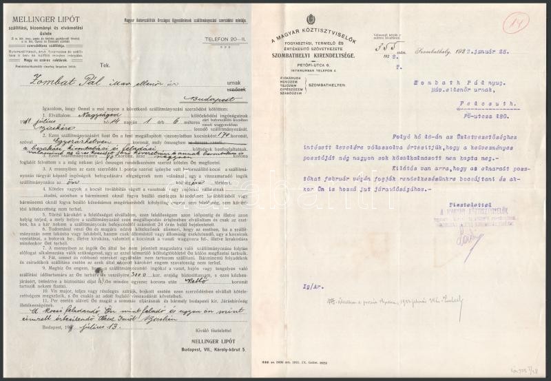 1883-1934 Vegyes reklámos számla tétel: közte Bp., Gitling C. Utóda (paplan), Schwartz Simon (női divat, 2 db), Klein Antal Uri- és női Divat nagy áruháza a "Magyar Királyhoz", Lustig Ede fehérnemü raktára, Gállik Lajos rézműves-mester; Bicske, Lichtenstein Mór Könyvnyomdája, Könykötészete; Wien, Rudolf Tánczos feuerfeste Cassen-, Cassetten-, Sicherheitsschlösser & Copirpressen-Fabrik, összesen, 8 db. + cca 1903 Bp., Ziegler Gábor asztalos reklámos névjegykártyája, bejegyzésekkel, 7x11 cm; cca 1900 Geizer Gerő építő-iparos mester reklámos kártyája, 5,5x9 cm +1911 Mellinger Lipót szállítási, bizományi és elvámolási üzletének fejléces, nyomtatott levele + 1922 A Magyar Köztisztviselők Fogyasztási, Termelő és Értékesítő Szövetezete, Szombathelyi Kirendeltségének fejléces, gépelt levele.