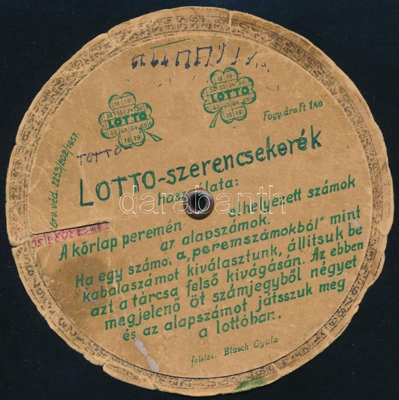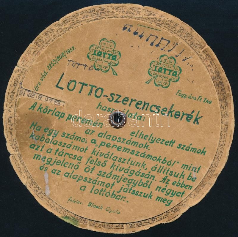 1957 LOTTÓ szerencsekerék, kopottas állapotban, d: 12,5 cm https://www.darabanth.com/de/402-Fernauktion/402.0/Kunst-Dokumente-andere-Sammelgebiete/Werbungen~500022/1957-LOTTO-szerencsekerek-kopottas-allapotban-d-12-5-cm~II2473902