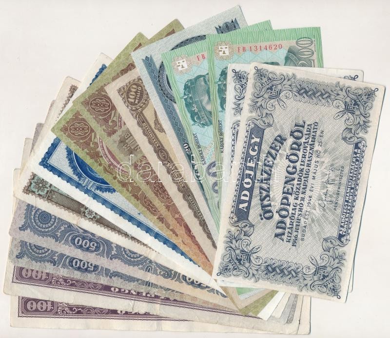 14db-os magyar Pengő és Forint bankjegytétel T:I-III https://www.darabanth.com/de/402-Fernauktion/402.0/Numismatik/Ungarische-Banknoten~2000007/14db-os-magyar-Pengo-es-Forint-bankjegytetel-TI-III~II2467813
