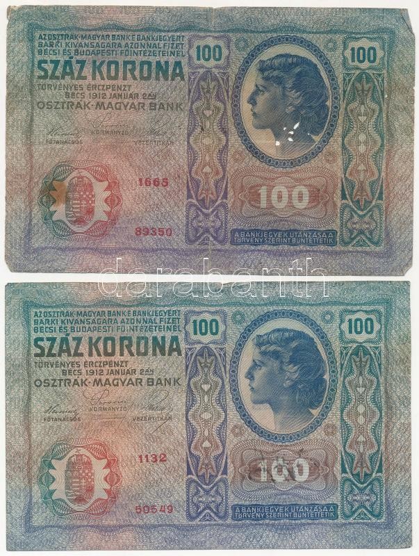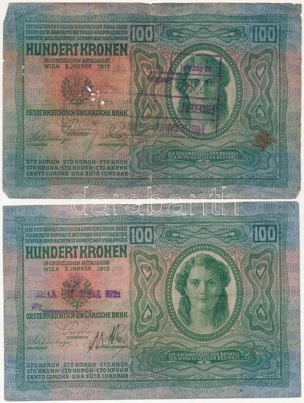 1912. 100K (2x, mindkettő kiolvashatatlan felülbélyegzéssel) T:III,III... https://www.darabanth.com/de/402-Fernauktion/402.0/Numismatik/Ungarische-Banknoten~2000007/1912-100K-2x-mindketto-kiolvashatatlan-felulbelyegzessel-TIII-III--Adamo-K28~II2473360
