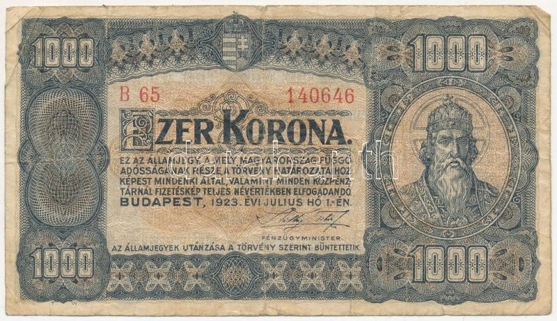 Beschreibung: 1923. 1000K nyomdahely jelölés nélkül T:III