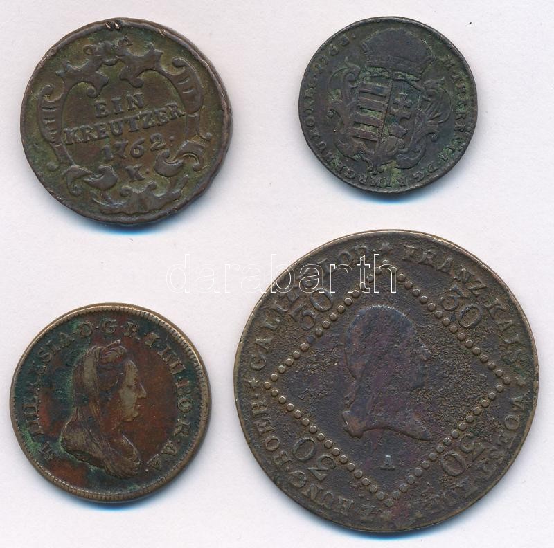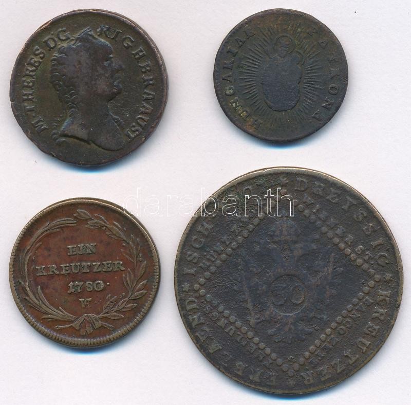 Hungary 1762K 1 Kreuzer Cu + 1763. Denar Cu "Maria Theresia / Closed crown" + Austria 1780W 1 Kreuzer Cu "Maria Theresia" + 1807A 30 Kreuzer Cu C:XF-F