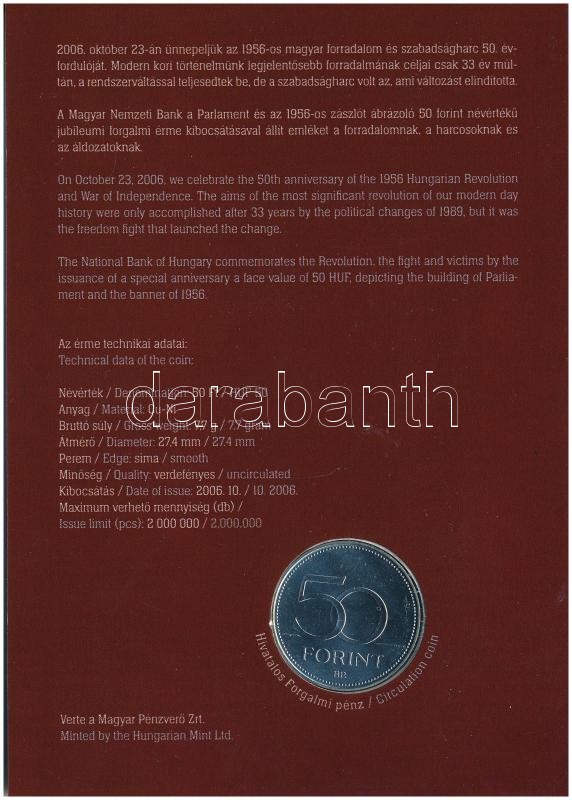 2006. 50Ft Cu-Ni "1956-os forradalom" emléklapon T:1,1- https://www.darabanth.com/de/402-Fernauktion/402.0/Numismatik/Ungarische-Munzen-und-Munzen-mit-ungarischem-Munzzeichen~2000008/2006-50Ft-Cu-Ni-1956-os-forradalom-emleklapon-T1-1-~II2457439
