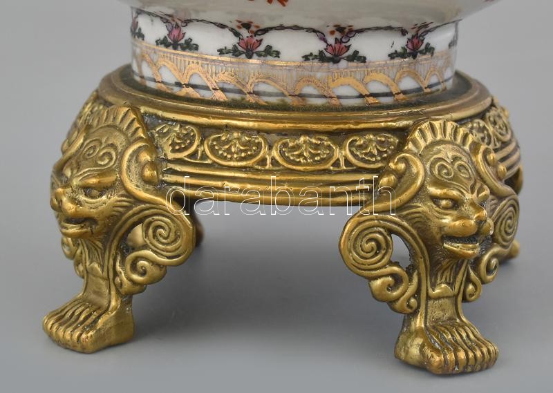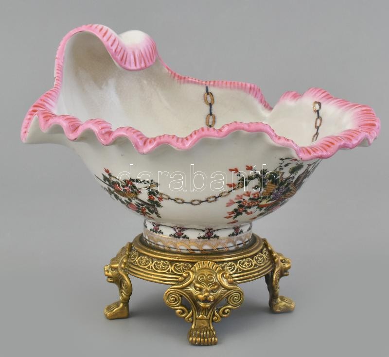 Beschreibung: Barokk kagyló alakú porcelán kínáló bronz talpon, jelzett, hibátlan. m: 18 cm