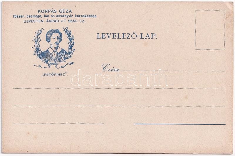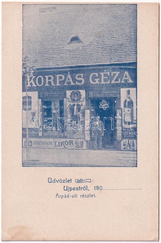 Beschreibung: Budapest IV. Újpest, Korpás Géza zsidó kereskedő üzlete "Petőfihez" Árpád út 26/A. Judaika / Hungarian Jewish shop advertisement. Judaica