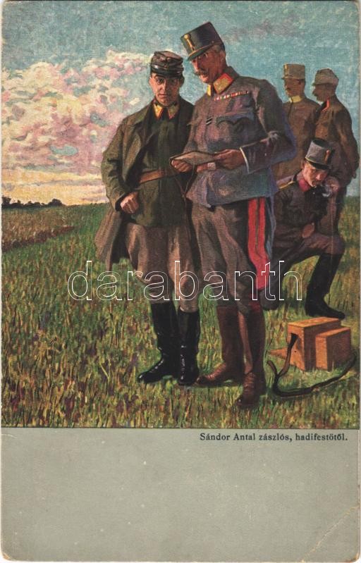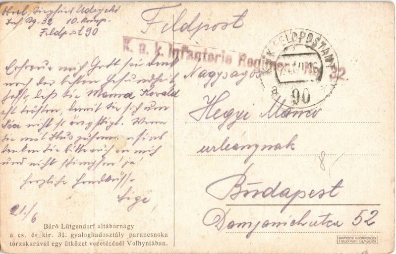 1916 Báró Lütgendorf altábornagy a cs. és kir. 31. gyaloghadosztály parancsnoka törzskarával egy ütközet vezetésénél Volhyniában. Sándor Antal zászlós hadfestőtől / WWI Austro-Hungarian K.u.K. military art postcard, Kasimir von Lütgendorf general commander with his officers coordinating a battle in Volhynia s: Sándor Antal + "K.u.K. Infanterieregiment No. 32." (EB)