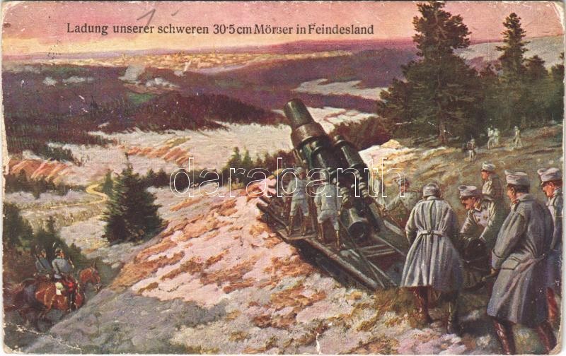 Beschreibung: 1916 Ladung unserer schweren 30,5 cm Mörser in Feindesland / WWI Austro-Hungarian K.u.K. military art postcard, mortar (EB)