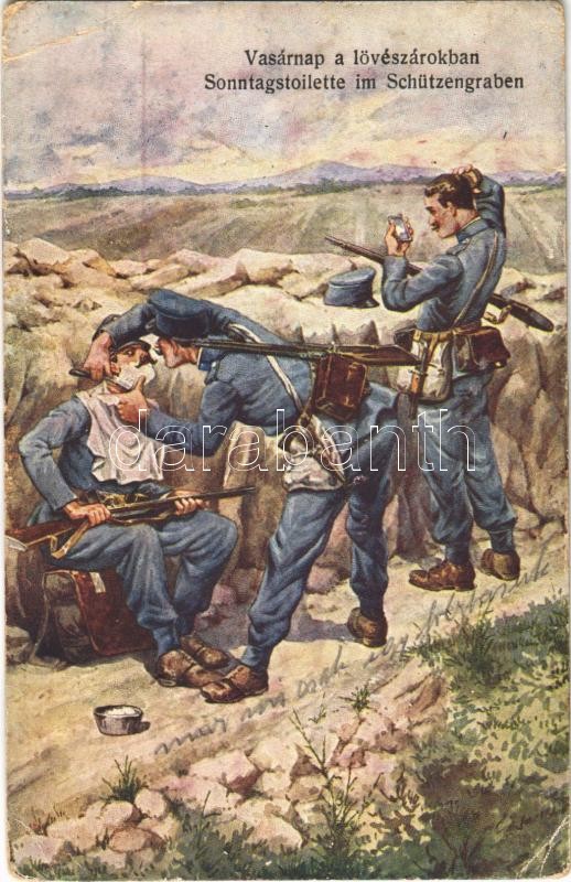 Beschreibung: 1917 Vasárnap a lövészárokban / Sonntagstoilette im Schützengraben / WWI Austro-Hungarian K.u.K. military art postcard, Sunday in the trenches (r)