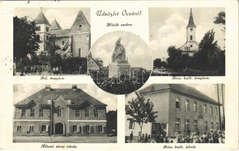 Beschreibung: 1934 Ócsa, Református templom, Hősök szobra, emlékmű, Római katolikus templom és iskola, Állami elemi iskola (EK)
