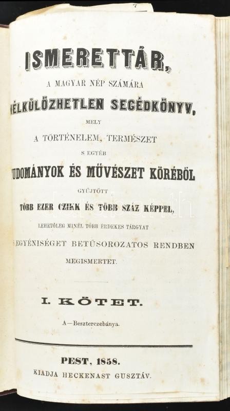Ismerettár, a magyar nép számára nélkülözhetetlen segédkönyv, mely a történelem, természet s egyéb tudományok és művészet köréből gyűjtött több ezer czikk és több száz képpel, lehetőleg minél több érdekes tárgyat és egyéniséget betüsorozatos rendben megismertet.I. köt.: A - Beszterczebánya. Pest, 1858, Heckenast Gusztáv, XVI+991 (kéthasábos számozás) p. Korabeli kopott félvászon-kötésben, kissé foltos lapokkal, benne a szócikkekre vonatkozó számos újságcikk kivágással, a számos jegyzetlapból adódó deformált kötéssel.