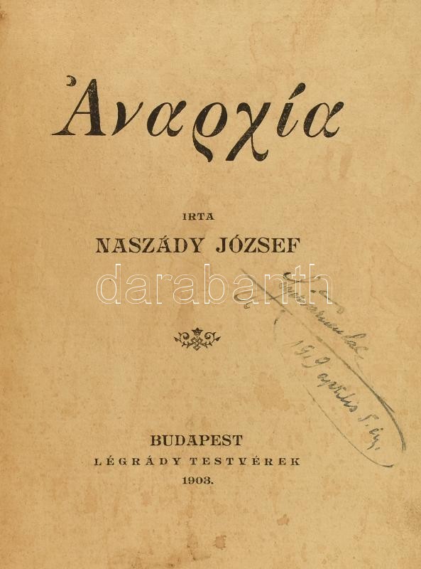 Naszády József: Anarchia. Bp., 1903., Légrády, 184 p. Átkötött korabeli félvászon-kötés, kopott borítóval, pár lapon ceruzás jegyzetekkel, belejelölésekkel, aláhúzásokkal,foltos címlappal. Korai utópisztikus, tudományos-fantasztikus mű. Rendkívül ritka!