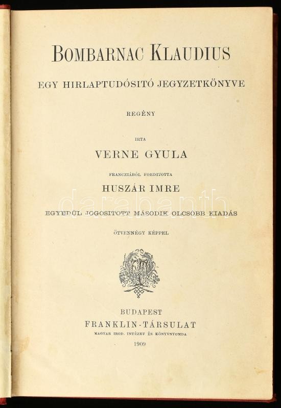 Verne Gyula: Bombarnac Klaudius. Egy hírlaptudósító jegyzetkönyve. Ford.: Huszár Imre. Verne Gyula összes munkái. Bp., 1909, Franklin-Társulat. 355 p. Második kiadás. Számos egészoldalas és szövegközi, fekete-fehér illusztrációval. Kiadói aranyozott, festett egészvászon-kötés, kissé kopott, sérült borítóval és gerinccel.