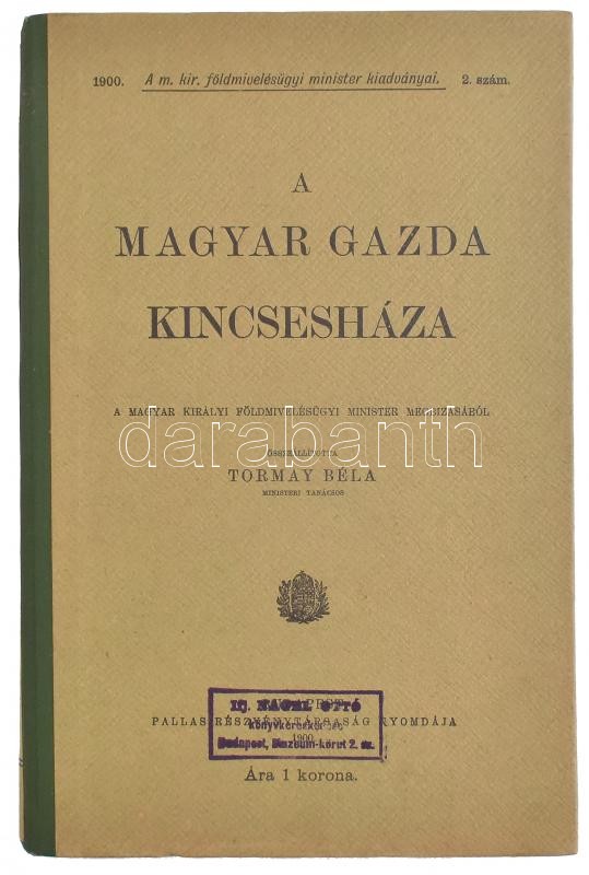 A magyar gazda kincsesháza. Összeáll.: Tormay Béla. A M. Kir. Földmivelésügyi Minister kiadványai. 2. szám. Bp., 1900., Pallas, XIII+362+6 p. Szövegközti illusztrációkkal. Kiadói félvászon-kötés, kissé kopott borítóval, kissé foltos lapokkal, aláhúzásokkal.