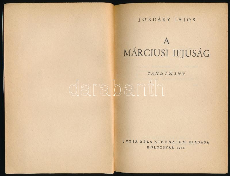 Jordáky Lajos: A márciusi ifjúság. - - tanulmánya. Kolozsvár, 1945., J... https://www.darabanth.com/de/403-Fernauktion/403.0/Bucher/Bucher-Geschichte~1500004/Jordaky-Lajos-A-marciusi-ifjusag--tanulmanya-Kolozsvar-1945-Jozsa-Bela-Kiadoi-pap~II2480449
