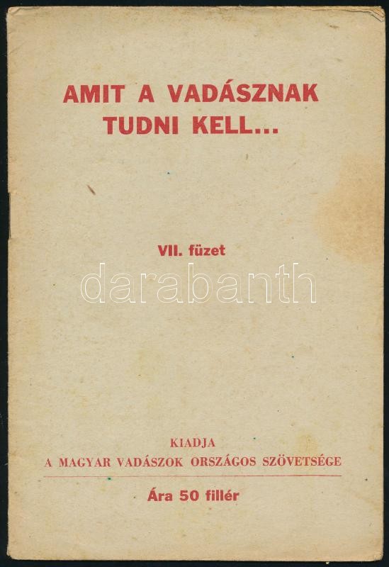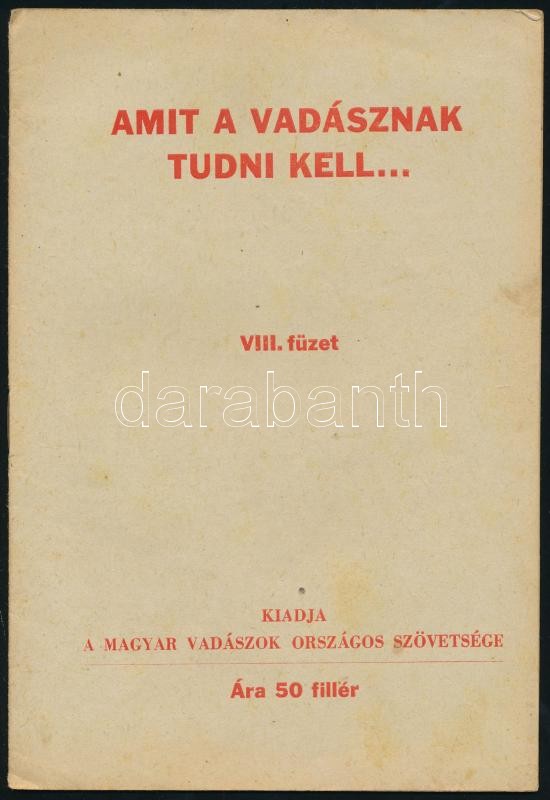 cca 1950-1951 Vadászati füzetek: Hogyan vadásszunk? I. füzet. + Amit a vadászatról tudni kell... IV.-VIII. füzet. Bp.,é.n.,Magyar Vadászok Országos Szövetsége, 16 p x 6. Kiadói papírkötések, egy borítón kissé szakadt, kissé foltos, a hátsó borítóján firka, kissé foltos.