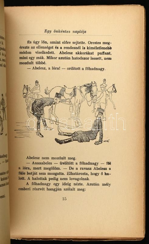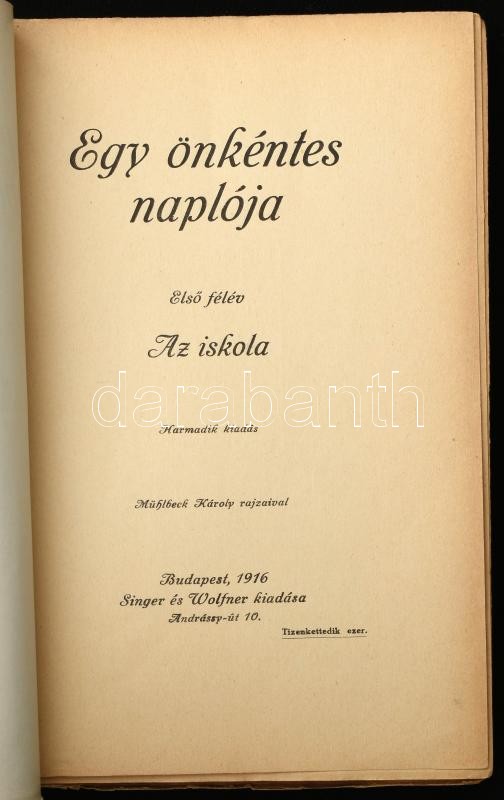Farkas Pál: Egy önkéntes naplója. Első félév. Az iskola. Mühlbeck Károly rajzaival. Bp., 1916, Singer és Wolfner. 143 p. Harmadik kiadás. Szövegközi, fekete-fehér illusztrációkkal. Kiadói illusztrált papírkötés, kissé sérült borítóval, helyenként sérült lapszélekkel.
