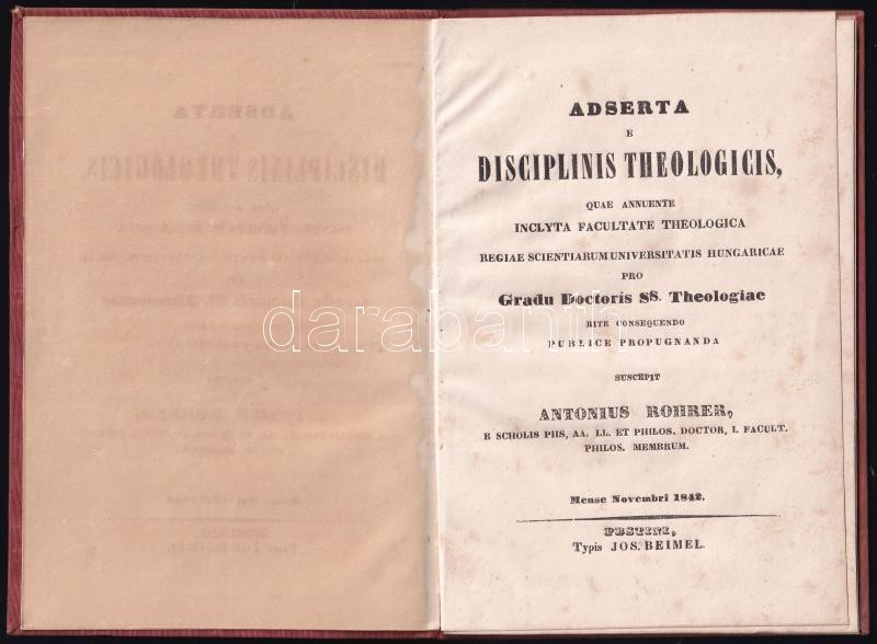 Rohrer, Antonius: Adserta e Disciplinis Theologicis, Quae Annuente Inclyta Facultate Theoogica Regiae Scientiarum Universitatis Hungaricae pro Gradu Doctoris SS. Theologiae Rite Consequendo Publice Propugnanda. Pestini (Pest), 1842, Typis Jos. Beimel. 15 p. Selyemkötésben, kissé foltos lapokkal.