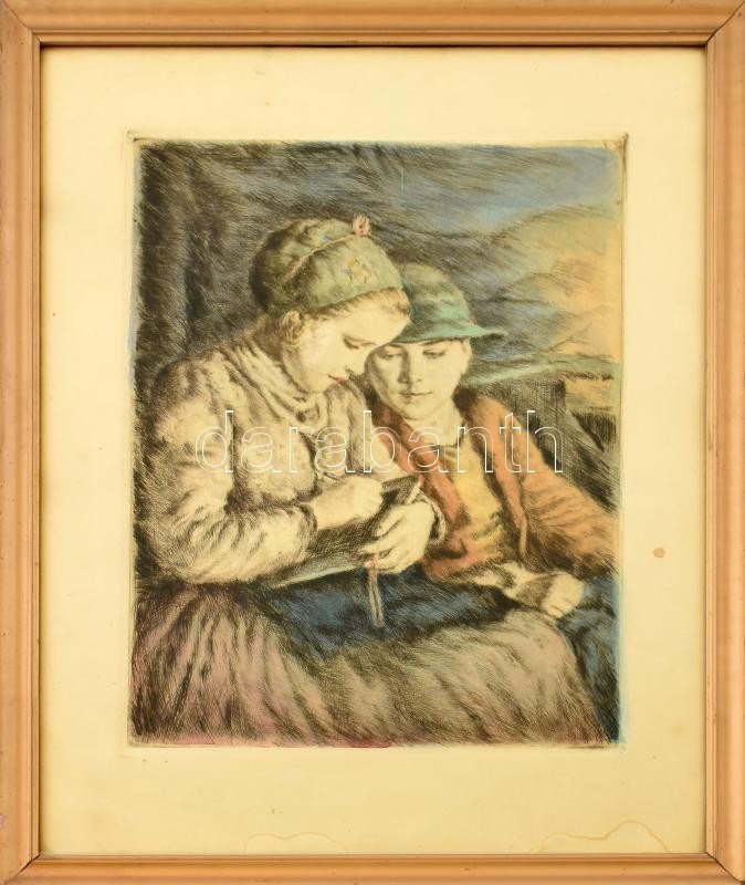 Beschreibung: Glatz Oszkár(1872-1958)-Prihoda István (1891-1956): Betűvetés. Színezett rézkarc, papír, jelzés nélkül. Üvegezett fa keretben, 35x27 cm