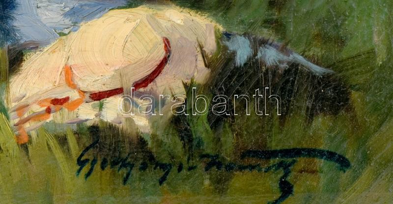 Beschreibung: Gyertyáni Németh Gyula (1892-1946): Pihenő hölgy a réten. Olaj, vászon. Jelzett. Restaurált. Dekoratív, sérült keretben. 44x62 cm