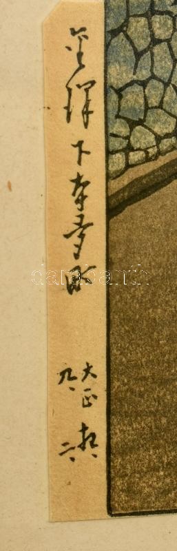 Beschreibung: Olvashatatlan jelzéssel, ismeretlen japán művész: Napernyős hölgy. Fametszet, papír, körbevágva. Üvegezett fa keretben. 36,5x24 cm
