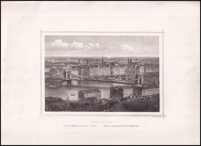 Beschreibung: cca 1860 Ludwig Rohbock (1820-1883) - Johann Poppel (1807-1882): Budapest, Ferenc József kőpart és Lánchíd, acélmetszet, 12×15,5 cm