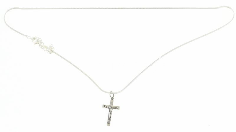 Beschreibung: Ezüst(Ag) kígyó nyaklánc, korpuszos kereszt függővel, állítható h: 45-50 cm, 2,8×1,5 cm, jelzett, nettó: 7,1 g
