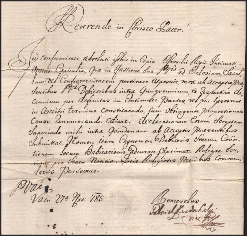 Beschreibung: 1786 Szerdahelyi Gábor (1742-1813) váci nagyprépost, püspöki helyettes, későbbi besztercebányai püspök aláírt, latin nyelvű levele, viaszpecséttel