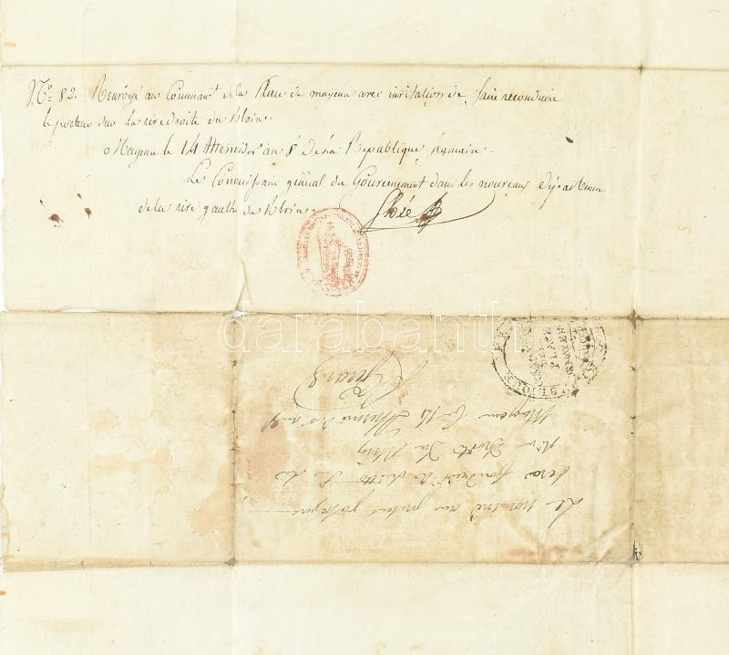 1800 Ehrenbreitstein (Koblenz városához tartozó erőd a Rajna túlpartján), gazdagon díszített, illusztrált céhlevél koblenzi mester részére, szárazpecséttel, hátoldalán francia nyelvű feljegyzésekkel. Kisebb sérülésekkel, hajtva, 42,5x34 cm