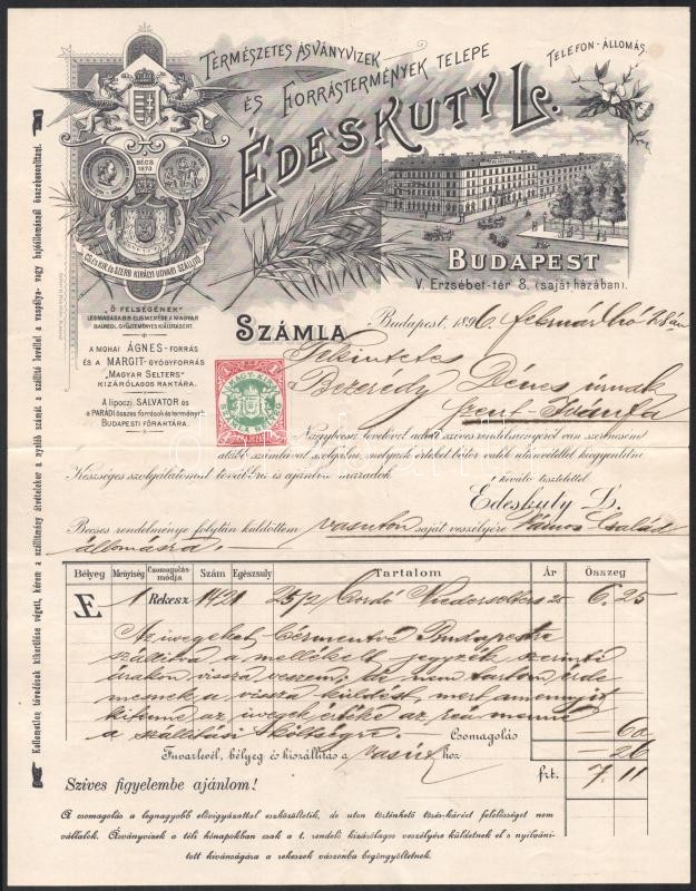 1896 Bp., Az ásványvíz-forgalmazó Édeskuty L. cég rendkívül dekoratív fametszetes fejlécű kitöltött számlája 1kr számlabélyeggel, hajtva, szép állapotban
