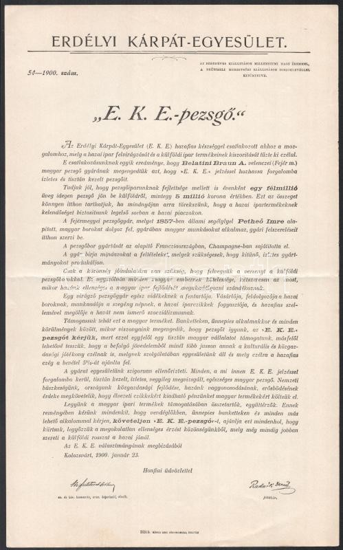 Beschreibung: 1900 Az Erdélyi Kárpát Egyesület (EKE) körlevele a velencei (Fejér megye) Belatini Braun A. által készített, EKE jelzésű pezsgő forgalomba hozataláról