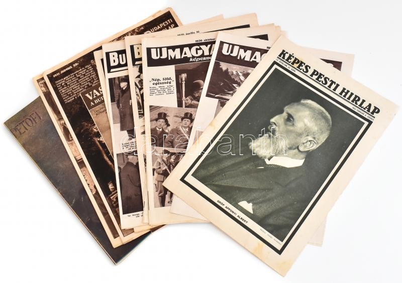 1931-1936 Vegyes újság tétel, 15 db: közte: Budapesti Hírlap Vasárnapjának 2 száma, Pesti Hírlap Vasárnapjának 1 száma, Vasárnapi Ujság a Budapesti Hírlap képes mellékletének 1 száma, Budapesti Hírlap képemellékletének 5 száma, Uj Magyarság képesmellékletének 4 száma, valamint a Képes Pesti Hírlap 1 száma (1933. feb. 8.). Benne a kor híreivel, fekete-fehér képekkel, rajtuk ismert emberek fotóival (pl.: Horthy, Mussolini, Gömbös Gyula, Hitler...stb. A Képes Pesti Hírlap számában Apponyi Albert gyászkeretes fotójával és az életéről szóló képekkel is.
