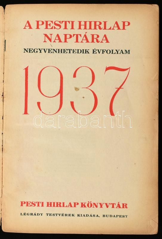 1932-1939 Pesti Hírlap Naptárának 4 száma (1932., 1937,1938, 1939.) Ko... https://www.darabanth.com/de/403-Fernauktion/403.0/Kunst-Dokumente-andere-Sammelgebiete/Drucksachen~500028/1932-1939-Pesti-Hirlap-Naptaranak-4-szama-1932-1937-1938-1939-Kopott-papirkotesek-es-C3~II2479595
