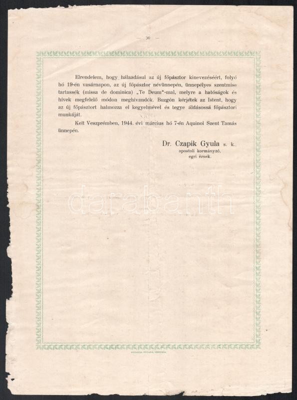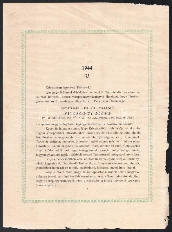 1944 Mindszenty József (1892-1975) veszprémi megyéspüspökké való kinevezéséről szóló hirdetmény, Czapik Gyula (1887-1956) egri érsek, volt veszprémi püspök által kihirdetve, Veszprém, Egyházmegyei Nyomda, 2 p.