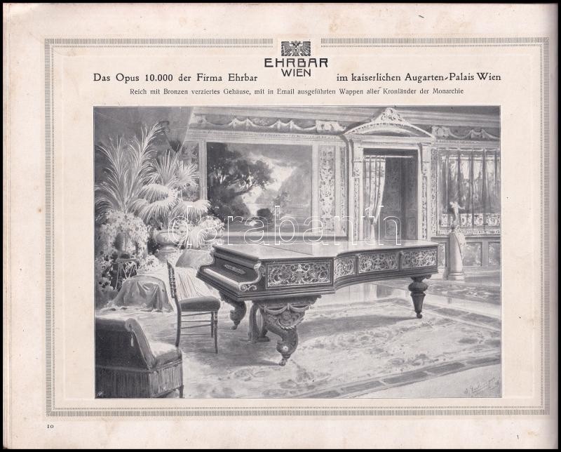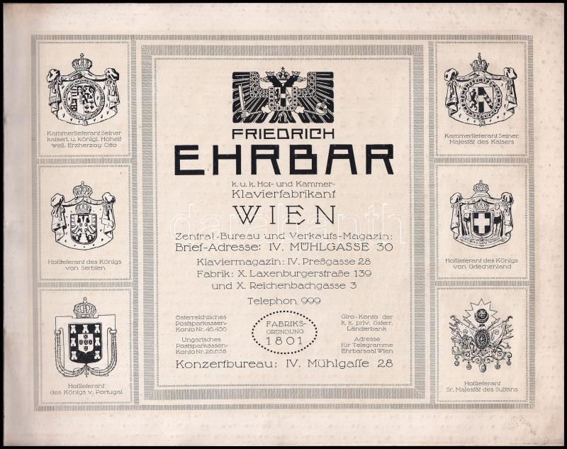cca 1906 Friedrich Ehrbar, k. u. k. Hof- und Kammer Klavierfabrikant, Wien. Wien, én., Chwala's Druck, 27+1 p. A bécsi Ehrbar Frigyes Cs. és Kir. Zongoragyár cég, német nyelvű, képes árukatalógusa, jó állapotban.