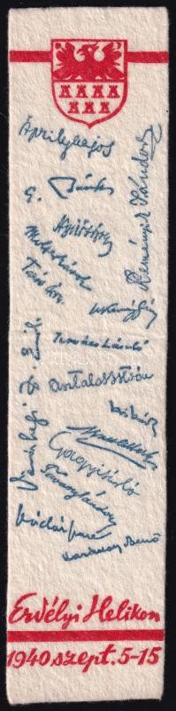 Beschreibung: 1940 Erdélyi Helikon halina könyvjelzője, sokszorosított aláírásokkal, 24x5,5 cm